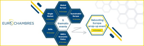 | Camera de Comerț și Industrie a României are plăcerea de a vă invita să participați la o serie de evenimente online, cu tema Rebooting Europe/Repornirea Europei, organizată de Asociația Camerelor de Comerț Europene (EUROCHAMBRES), în perioada 12-14 octombrie 2020.